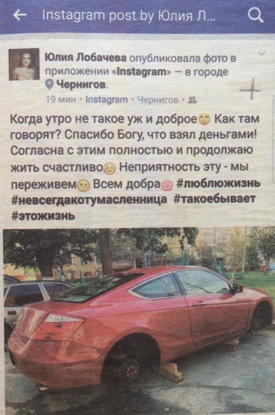 Под надписью — снимок ее автомобиля «Хонда Аккорд» без колес.
