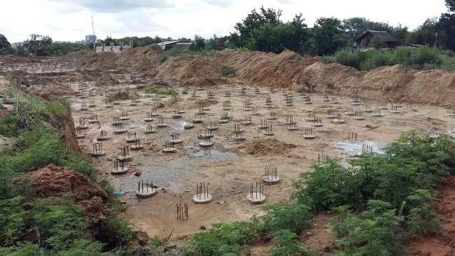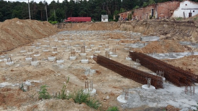 Пока на территории стройки просматриваются три больших котлована с разной степенью завершенности работ по укладке фундамента.