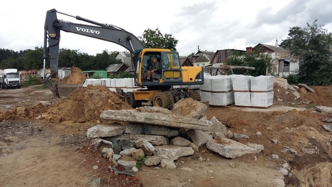 Прораб Александр подтвердил, что работы только начались, здесь укладывают фундаменты для устойчивых грунтов, потом последует монтаж блоков, перекрытие первых этажей. Будут ли еще рыть новые котлованы - он пока не знает. Почти впритык к котлованам стоят разрушенные помещения ПМК и старые жилые дома.