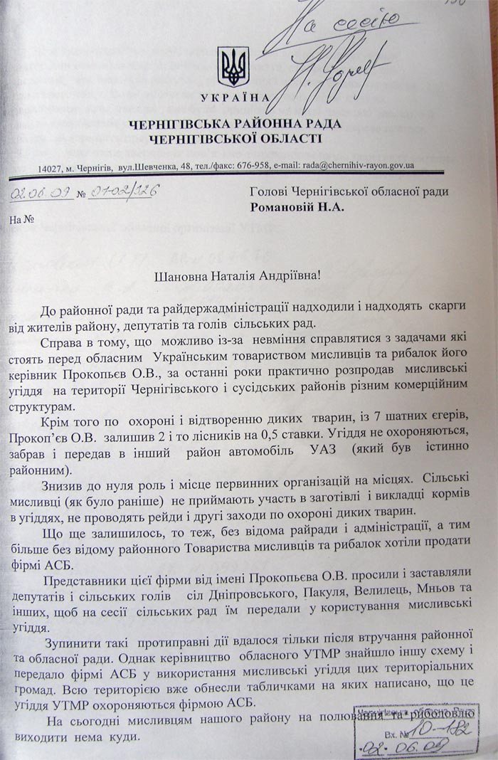 Фірма "АСБ" разом з Прокопьєвим по 4 рази вивертали навиворіт сільради Дніпровського, Пакульську, Мньовську, Ведільську, хотіли отримати угіддя. По 4 рази кожна з цих сільрад відмовляла фірмі "АСБ" у дозволі на те, щоб ця фірма оформила на себе мисливське користування.