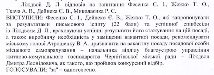 По по ссылке можно ознакомиться с протоколом №4 заседания конкурсной комиссии Черниговского горсовета от 10.03.2020, в котором говорится, что Лиждвой был единственной кандидатурой на должность начальника отдела благоустройства УЖКХ черниговского горсовета.