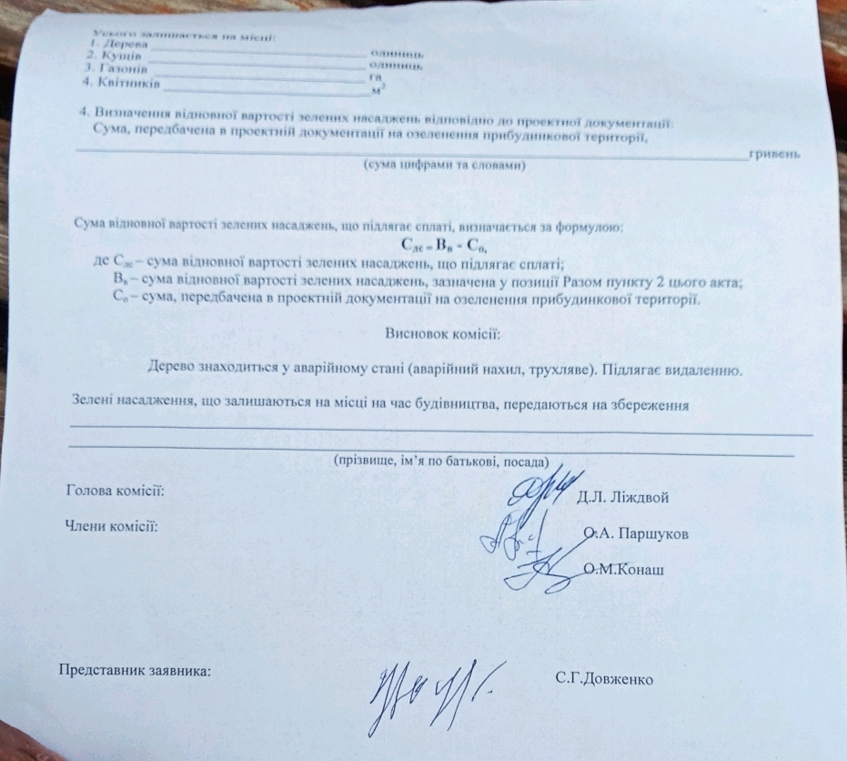 В акте обследования, выписанном за подписью Лиждвоя, написано: ”Дерево находится в аварийном состоянии (аварийный наклон, трухлявое”). Это говорится именно о дереве, фото которого уже было опубликовано в статье на сайте Gorod.cn.ua.