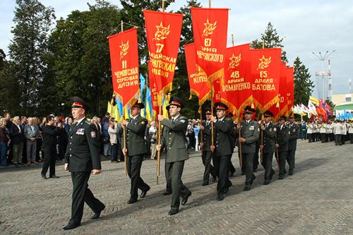 Під час параду пронесені бойові прапори військових частин 1-ї гвардійської армії, воїни якої визволяли Чернігів у роки війни. Завершили урочисте проходження військ гарнізону наймолодші його учасники, вихованці Чернігівського ліцею з посиленою військово-фізичною підготовкою.