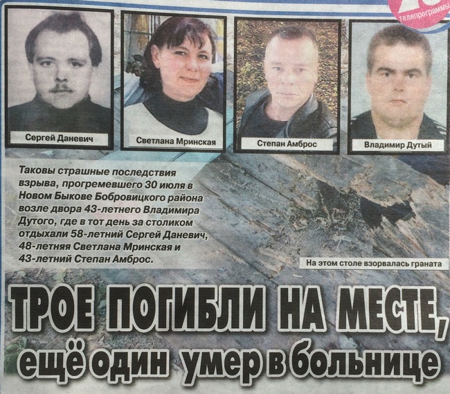 Компания общалась, выпивала. Вечером домой вернулся хозяин и попросил продолжить гулянку в другом месте. Это взбесило Даневича, и он пригрозил убить Владимира. Пошел домой, а через мгновение вернулся... с гранатой. Уже через несколько минут, около 20 часов, раздался взрыв... Сергей и Светлана погибли сразу. Степан промучился еще минут пять. Дольше всех за жизнь боролся Владимир Дутый. В тот вечер его в тяжелом состоянии госпитализировали в Бобровицкую ЦРБ, а на следующий день перевезли в Областную больницу. Однако спасти так и не смогли — 2 августа он тоже умер.