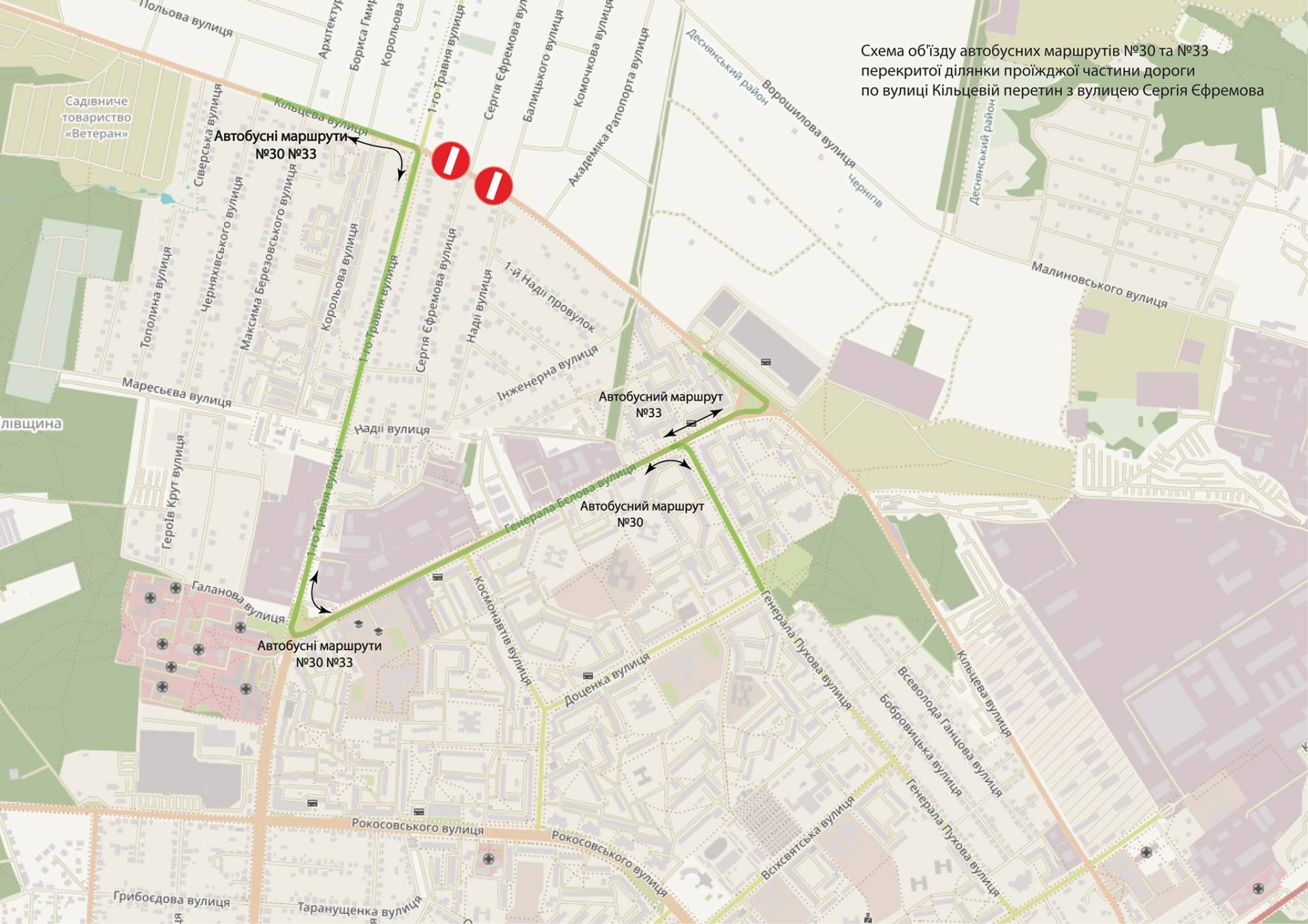 На період проведення ремонтних робіт на перехресті вулиць Кільцева – Сергія Єфремова з 8.00 год. 10 серпня до 17.00 год. 17 серпня вносяться тимчасові зміни у шлях проходження транспортних засобів: