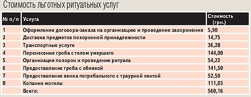 По словам Валерия Кулиша, директора КП «Спецкомбинат», средняя стоимость одного захоронения сегодня обходится в 669 грн. и продолжает расти с каждым днем. Тем не менее, предприятие продолжает хоронить «льготников», как и три года назад, за сумму, на сотню гривен меньшую среднестатистической. Городской бюджет компенсирует коммунальному предприятию всего 560 грн. 16 коп. Правда, за эти деньги усопшему, чьи прижизненные заслуги подпадают под действие Закона Украины «О захоронении и похоронном деле», «Спецкомбинат» предоставит все необходимые услуги.