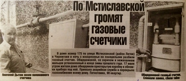 В доме номер 175 по улице Мстиславской (район Летки) в Чернигове в ночь с воскресенья на понедельник разбили газовый счетчик. Общедомовой, со скрипом и нежеланием жильцов установленный в конце зимы прошлого года. 17 июля утром жители дома обнаружили приоткрытую коробку и обломки прибора под ней. Приехала аварийная служба и перекрыла газоснабжение всему дому. Пятиэтажка, 90 квартир.