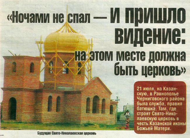 Строится церковь по испытанному проекту. Похожая стоит в Днепровском Черниговского района и в Грабовке Куликовского. Будет колокольня. Материалы стараемся использовать самые хорошие. Конечно те, которые можем позволить в финансовом плане. Людям говорю: не ходите, не клянчьте деньги. Все придет, когда нужно будет.