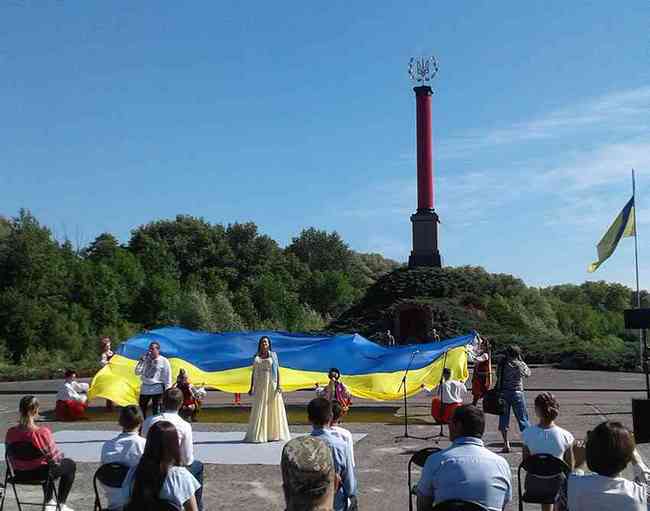 Після офіційних виступів у Крутах розгорнули 20-метровий синьо-жовтий стяг.