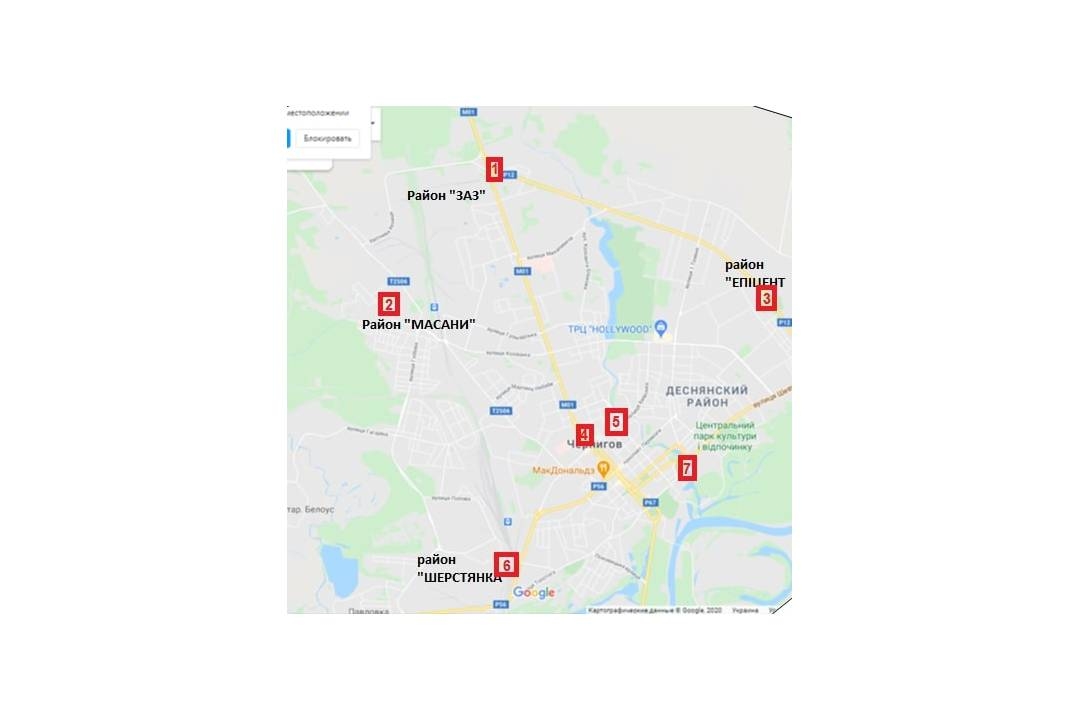 На розгляд мешканців міста виносяться наступні локації таких місць: (на карті локації виділені червоними прямокутниками та пронумеровані):