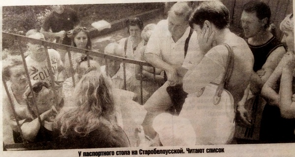 В субботу, 19 августа, в час дня по улице Старобелоусской возле паспортного стола — толпа людей. Время «переклички». Формируется лист на подачу документов на следующий рабочий день. Из 20 человек, к которым подошла очередь. Если твоя очередь подошла, а ты не пришел отметиться или опоздал, тебя вычеркивают.