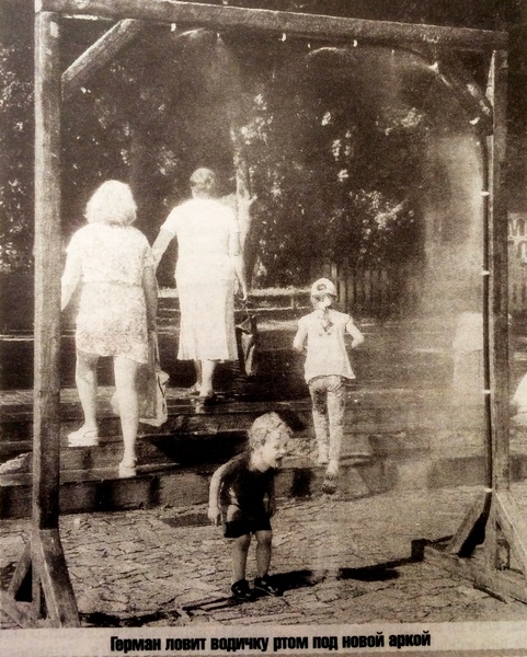 В субботу, 19 августа, в обед на градуснике — плюс 31. Взрослые проходят сквозь арку. Детвора бегает, пока не промокнет футболка и шорты.