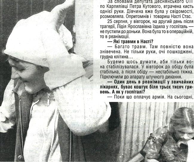 У Києві, в реанімації Головного військового клінічного госпіталю бореться за життя 18-річна Анастасія Шестакова з Карпилівки Козелецького району. Дівчина, яку 24 серпня розірвало гранатою у гуртожитку контрактників військового селища Десна (див. «Вісник» за 27 серпня).