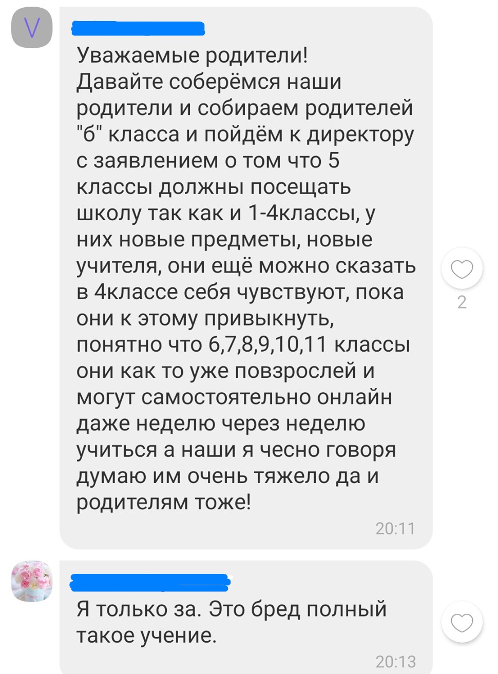 Тем временем в родительских чатах школ стали появляется сообщения, с предложениями пойти к директору с заявлением о том, чтобы 5-11-классники ходили в школу так же, как и ученики 1-4 классов – то есть каждый день.