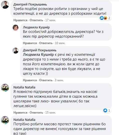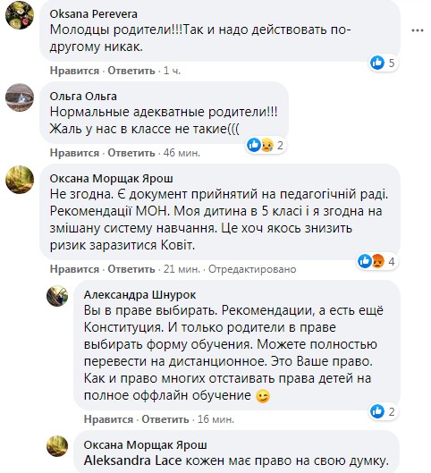 "Добрий день. Від імені батьків учнів 5-11 класів хочемо виразити своє невдоволення діями влади, а саме введенням так званої змішаної форми навчання, коли півкласу не має права прийти на уроки з 07.09.2020, і звертаємося до редакції сайту з проханням запросити до діалогу Василія Білогуру та представників батьківської громади для обговорення цього гострого питання. Вважаємо дії влади незаконними та збираємося організовувати акції протесту. Дякуємо за увагу".