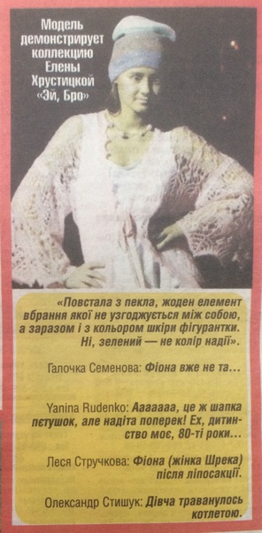 «Коли тема «упоротого лыса» стає ключовою в колекції дизайнера. Та що там в колекції! Навряд чи їй вдасться перевершите цю клізьму з хутра, яку вона чомусь ставить в голову моделі. Від цього всі біди, треба підказати дизайнеру, куди ставити клізьму, може, так калу в її творчості поменшає», — комментарий на «Рагулі» про шляпку, декорированную шкуркой лисенка.