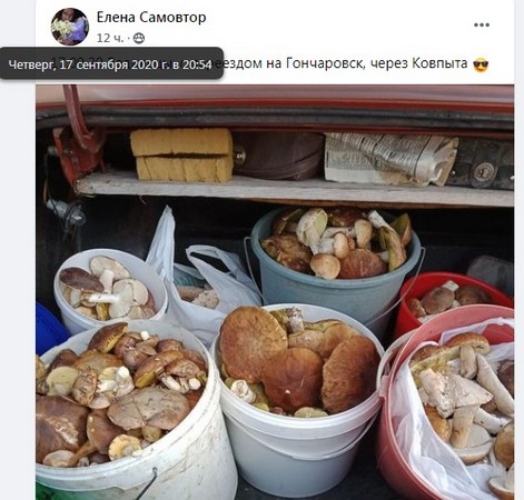 Елена Самовтор 17.09.20 в Ведильцах, с переездом на Гончаровск, через Ковпыту насобирала 4 ведра грибов.