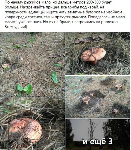 16 сентября топовый грибник группы Алексей Очеретько сдал грибное место на рыжики. С 8.00 до 10.30 он насобирал четыре ведра отборнейших грибочков. Как добраться: едете на Славутич, увидите указатель на Мнев, за ним перекресток, поворачиваете направо, проезжаете метров 50, с правой стороны, как ориентир, будет сухая берёза (см. фото 5). Все вы на месте, в принципе можно не сворачивать, но незачем устраивать толкучку на обочине трассы. Слева будет сосновый лесок - туда не ходите, сухой, на сто метров два мухомора. А вот справа будут реденькие сосенки - Вам туда. По началу рыжиков мало, но дальше метров 200-300 будет больше. Настраивайте прицел, все грибы под хвоей, на поверхности единицы, ищите чуть заметные бугорки на хвойном ковре среди сосенок, там и прячутся рыжики. Попадалось не мало маслят, уже осенних. Но их не брали, настроились на рыжиков. Всем удачи!, - написал в посте мужчина.