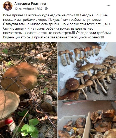 Кроме позитива у сборщиков грибов встречаются и случаи экстрима. Так, Ангелина Елисеева рассказала, что 12 сентября поехала под Славутич за грибами и на плач ее ребенка вышел вожак стаи волков. Правда, волк, только посмотрел на людей и ушел. Поэтому Ангелина предупредила всех, кто собирается за грибами, что не делали это под Славутичем, а ехали, к примеру в Видельцы.
