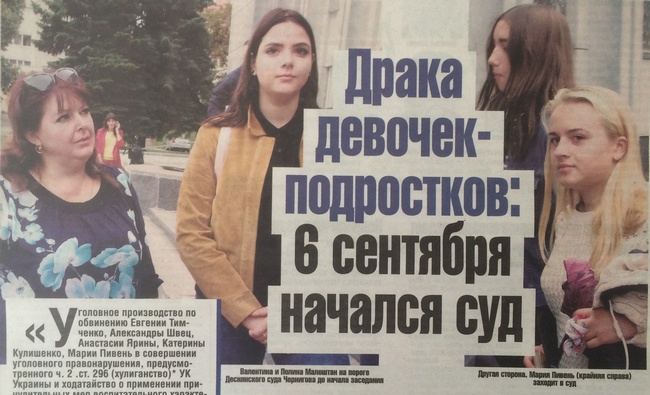 6 сентября в 12.30 началось рассмотрение самого резонансного черниговского дела 2017 года. Помните, весной была драка девочек-подростков за «Мегацентром», бывшей «Дружбой»? Пострадала Полина Малоштан. Так вот, ягодки созрели, время сбора урожая.