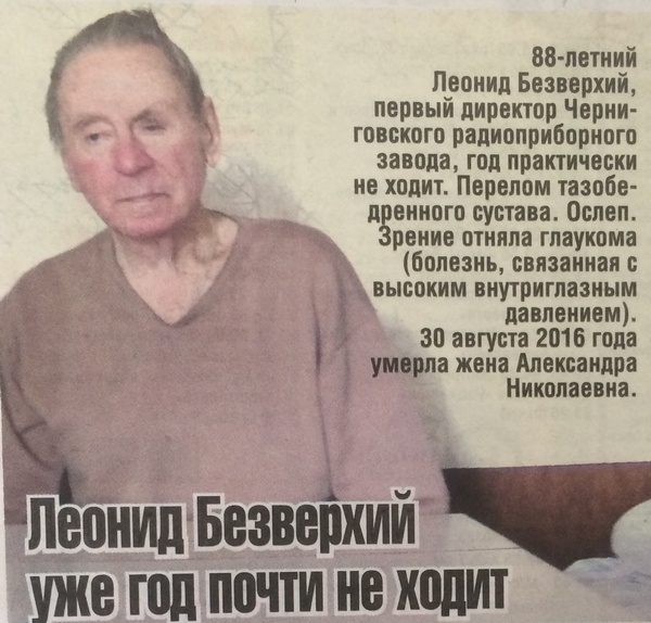 88-летний Леонид Безверхий, первый директор Черниговского радиоприборного завода, год практически не ходит. Перелом тазобедренного сустава. Ослеп. Зрение отняла глаукома (болезнь, связанная с высоким внутриглазным давлением).