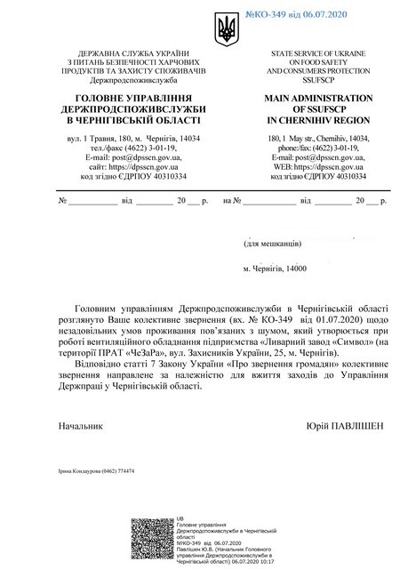 -коллективное письмо жителей дома относительно неудовлетворительных условий проживания, вызванных шумом, который создается при работе вентиляционного оборудования предприятия, направлено в Управление гоструда в Черниговской области. Там ответили, что этот вопрос не в их компетенции.