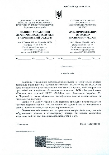 Также в ответ на многократные жалобы в Госпродпотребслужбу в Черниговской области жильцам дома приходили ответы о том, что: