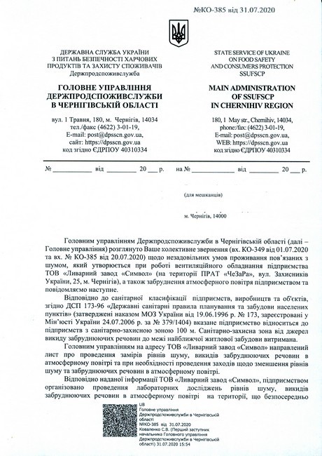 Жители дома много раз обращались к государственным структурам, которые должны регулировать деятельность подобных предприятий, но ответы их не устраивают. Логично, что первыми, к кому они обратились, была Государственная экологическая инспекция в Черниговской области. В кратком ответе от 17.08.2020 говорилось о том, что в результате проведенной проверки выяснено, что выбросы загрязняющих веществ производятся без соответствующего разрешения, а влияние шума на здоровье человека и определение санитарных зон относится к компетенции Госпродпотребслужбы.