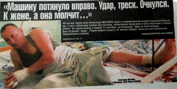 49-летний черниговец Александр Жоголко лежит в травматологии второй городской больницы. У него небольшие синяки под глазами, забинтована левая рука и нога (перелом в голеностопе). Он чудом выжил в аварии 11 сентября, на Головосек. Один из пяти человек.