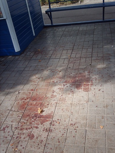 Сегодня утром на наш электронный адрес пришли фото, где были запечатлены пятна крови, прямо на остановке, возле магазина «Прогресс». Автор фото утверждает, что проезжая на авто мимо этого места, вчера вечером, видел более жуткую картину – буквально вся остановка была залита кровью. Наш корреспондент обратился с вопросом по этому поводу в правоохранительные органы – на что те ответили, что тревожных сигналов из этого района к ним не поступало.