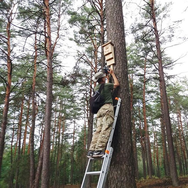 Але з весни кажани ні в один будиночок ще не заселилися. Беремо у лісників розкладну драбину, залазимо, перевіряємо, а їх все нема.