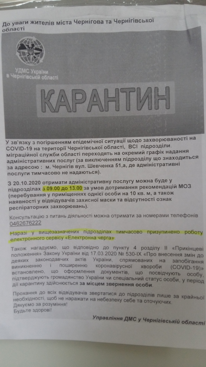 - О нашей работе можно узнать на официальном сайте Государственной миграционной службы Украины, на нашей страничке в FB, по телефонам “горячей линии” Управления миграционной службы в Черниговской области (0462) 666-185, территориальных подразделений, по объявлениям, размещенным на входах в подразделения. Оперативно нам передаются вопросы, заданные по электронной почте, размещенной на сайте Управления.