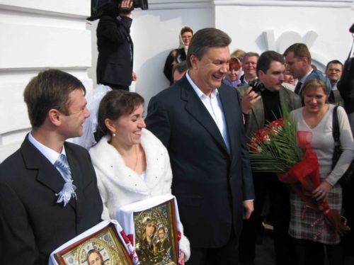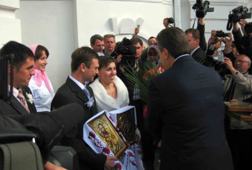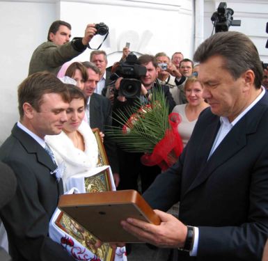 В подарок от лидера Партии регионов молодым – цветы, иконы и плазменный телевизор