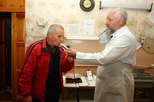 Вторую половину дня четырем «разнокалиберным добровольцам» – 67, 62, 50 и 48 кг – предстояло провести в «Кабінеті медичних оглядів на стан алкогольного сп’яніння». Нас радушно встретили сотрудники – ведь с трезвыми клиентами, согласитесь, всегда приятнее вести беседы, и не только светские! А дабы убедиться, что мы такими и являемся, а также – и в первую очередь! - для чистоты эксперимента, нам сразу же предложили подуть в «трубочку». А вернее – в специальный одноразовый сменный наконечник аппарата «АлКонт». В результате – всё по нулям! Что ж, хороши цветочки, будут ли такими ягодки?