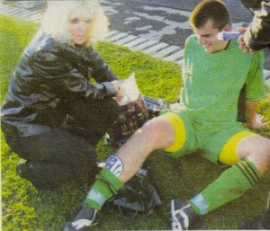 Потираючи коліно і важко дихаючи від болю, він сидів недалеко від воріт. Розстроївся: «Там хлопці на полі. А я тут. Ех!» До нього підбігли медики: