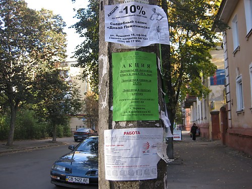 Согласно правилам благоустройства города Чернигова, расклейка листовок, объявлений, рекламы и прочего, в местах, не предназначенных для этого, категорически запрещена. К этому относятся – столбы, светофоры, стены и двери жилых домов, в общем, все то, что не разрешено Правилами. На многих троллейбусных и автобусных остановках есть специальные стенды, где рекламную информацию можно размещать, причем совершенно бесплатно. Конечно, вид у этих стендов не совсем эстетический, но, по крайней мере, они есть.