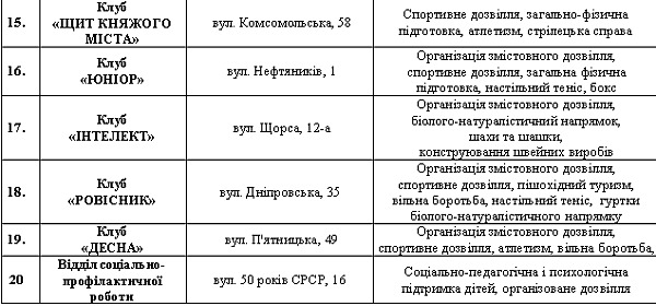 Клуби Центру пропонують широкий вибір гуртків та секцій: це спортивний напрямок, біолого-натуралістичний, краєзнавчий, технічної творчості, декоративно-прикладного мистецтва, хореографія, туристичний напрямок, клуб інтелектуальної молоді, скаутинг та гайдинг, а також соціально-психологічна допомога. За більш детальною інформацією про час і розклад роботи гуртків і секцій звертайтесь безпосередньо до педагогів-організаторів клубів, або за телефоном 5-34-31.