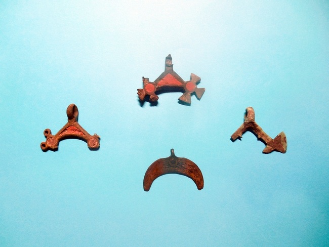 Це так званні лунниці (за формою нагадують місяць із ріжками). Чотири вироби виготовлені з бронзи, три з них мають сліди емалі.