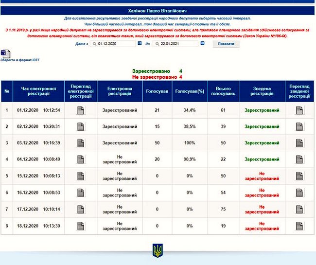 За даними електронної реєстрації та голосувань, у грудні 2020 року Павло Халімон пропустив 4 з 8 пленарних засідань Ради, тобто 50%.