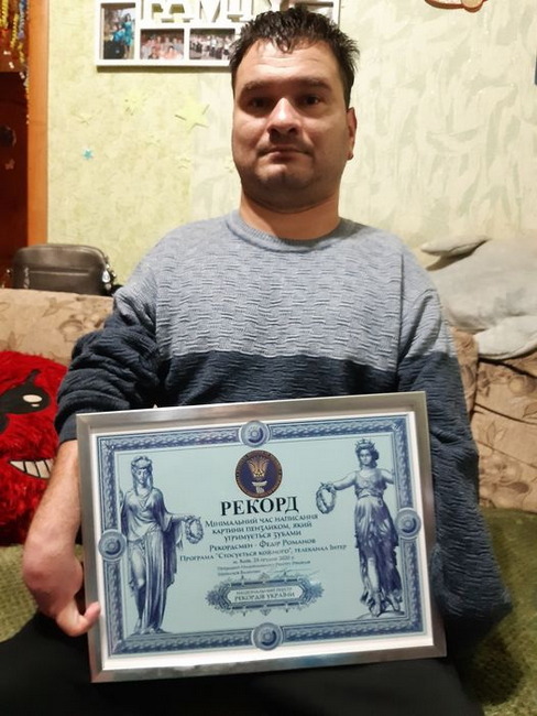 31-річний Федір Романов із села Дослідне Носівської об’єднаної територіальної громади заради своєї доньки Кіри встановив рекорд України з написання картини, тримаючи пензлик зубами.