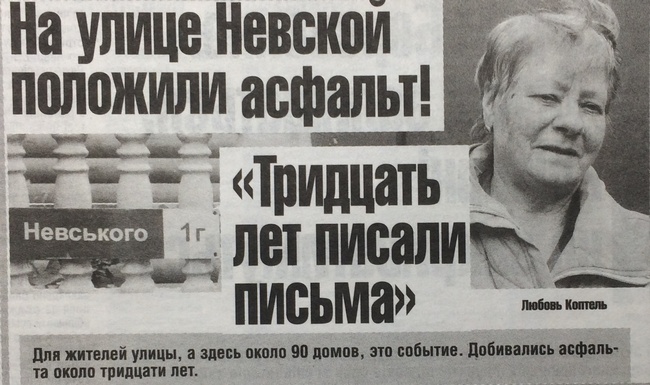 Кстати, кто-то написал жалобу. Так приезжали сюда из общества по защите прав населения. Искали, кто посодействовал, что именно улицу Невского заасфальтировали. Может, жаловался кто с соседней улицы, где асфальта нет. Мол, почему не им. У меня спрашивали, как я познакомились да с кем контактировала, чтоб улицу сделали.