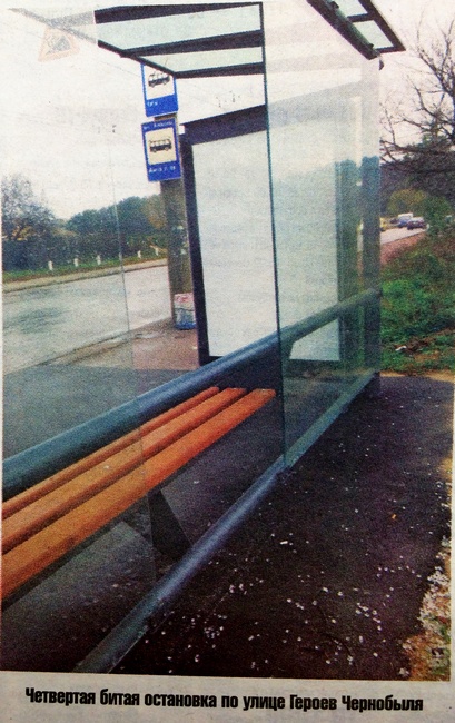 20 октября разбили еще одно стекло, на новой остановке по улице Героев Чернобыля (неподалеку от дамбы на Стрижне на становке табличка: «Ул. Алексеева, авт. №№19,21,26, троллейбус №10») в Чернигове.