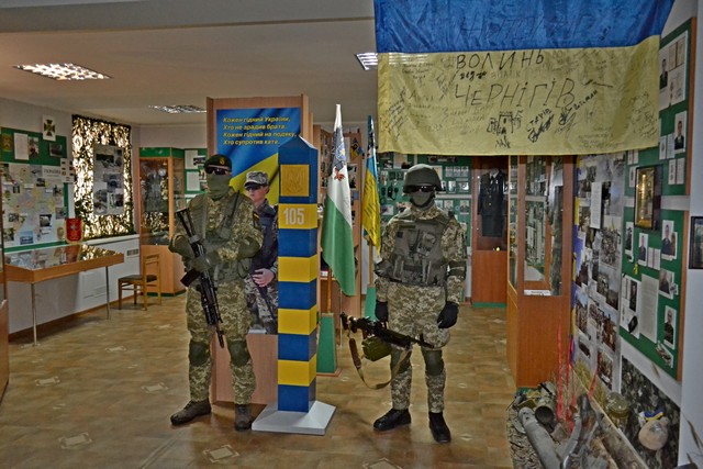 На фото приміщення музею Чернігівського прикордонного загону, справа вгорі - прапор, який привезли чернігівські прикордонники з першої ротації в зону АТО. В музеї є стенд присвячвений Ігору Нешко 1978-го року народження, який в 2015-му році загинув на Сході країни