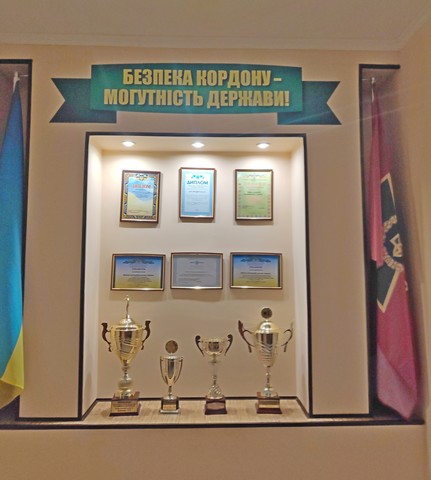 На фото - стенд з кубками та дипломами зі спортивних змагань, в яких брали участь прикордонники