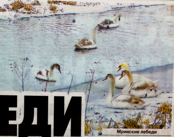 После последних событий в Мрине (о приватизации помещения, в котором находится Мринский сельсовет, мы писали в №4 от 21 января) появление лебедей местные жители восприня ли как добрый знак. Кроме того, увиде ли в этом и определенный символизм Мринская община объединила семь на селенных пунктов — Мрин, Хотиновку, Селище, Плоское, Лихачов, Киселевку и Раздольное, именно столь ко лебедей сейчас обитают на водоеме.