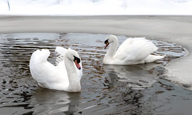 8 февраля в Мрине (Носов-щина) на местном водоеме рыбаки заметили целую семью лебедей —двух взрослых птиц и пятеро малышей. Они облюбовали тот участок реки, где вода не замерзает.