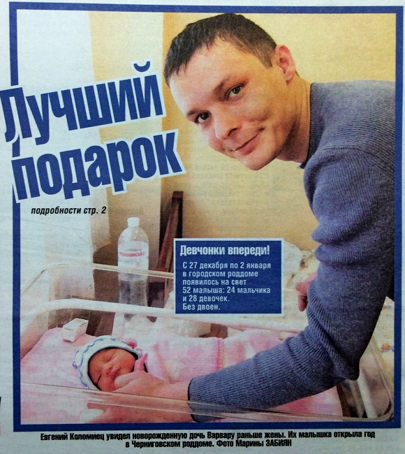 2 января на первом этаже в палате Черниговского городского роддома 31-летний Евгений Коломиец аккуратно вытирает новорожденной дочурке ротик салфеткой. Малышка первой появилась на свет в новом году. Время — 9.16. Вес — 2580, рост — 52 сантиметра.