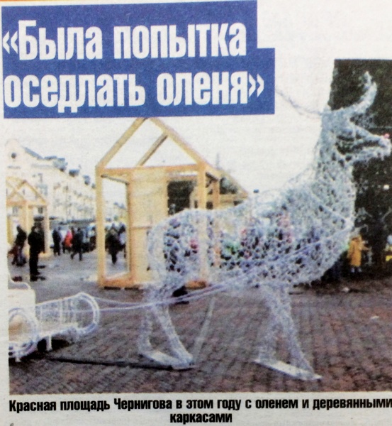 — Была попытка оседлать оленя, порвалась линия, и ее нужно было чинить, — комментирует начальник управления культуры Черниговрады Александр Шевччук. — Некоторые жители нашего города думают, что олень станет живым, если залезть на него сверху. Хотели с оленем подружиться, залезть и покататься, — шутит.