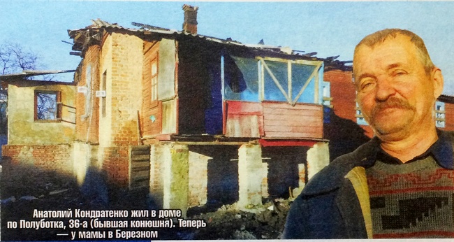— Только мы с дочкой ничего не получили, — возмущается 60-летний Анатолий Кондратенко. — Прописаны в квартире №10 по Полуботка, 36-а вдвоем, — Анатолий Николаевич в подтверждение показывает паспорт с пропиской, — а живу где попало, на заработки езжу. В Киев на строительство, иногда во Львов. Дочка Ирина взрослая, 28 лет, она родилась на Полуботка. С женой развелись 20 лет назад, где она сейчас, меня не интересует.