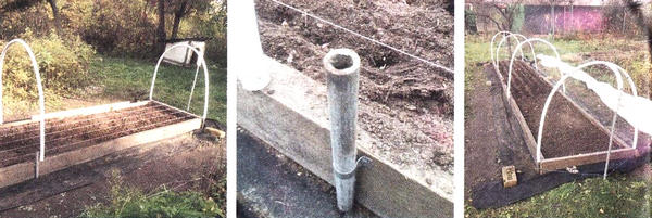 Верхние части труб я скобой прикрепил к бордюрным доскам. Это обязательно. Во-первых, забитая в землю труба не позволит грунту распирать грядку. С таким креплением можно при желании или необходимости поднимать грядку на 25 см и более. Во-вторых, прикрепленная к доске труба будет устойчивой, не расшатается со временем. В-третьих, выпуск трубы на 10 см позволяет устойчиво надевать на нее металлопластиковую трубу.